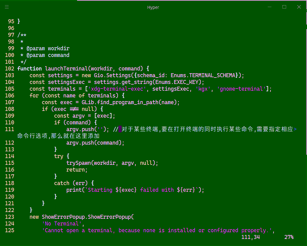 但是,在修改默认终端后,很有可能出现无法正常在终端打开桌面的情况。对于 GNOME 桌面,仅仅修改默认终端模拟器是不够的,要想完美变更默认终端,还需要直接修改 GNOME 扩展模块源码。