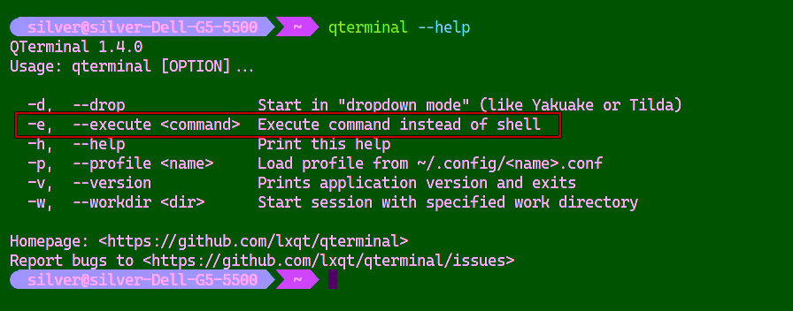 然而,并不是所有的终端模拟器都遵循这样的使用方法。比如,qterminal 就不是这样的,它需要在 command 前面添加一个 -e